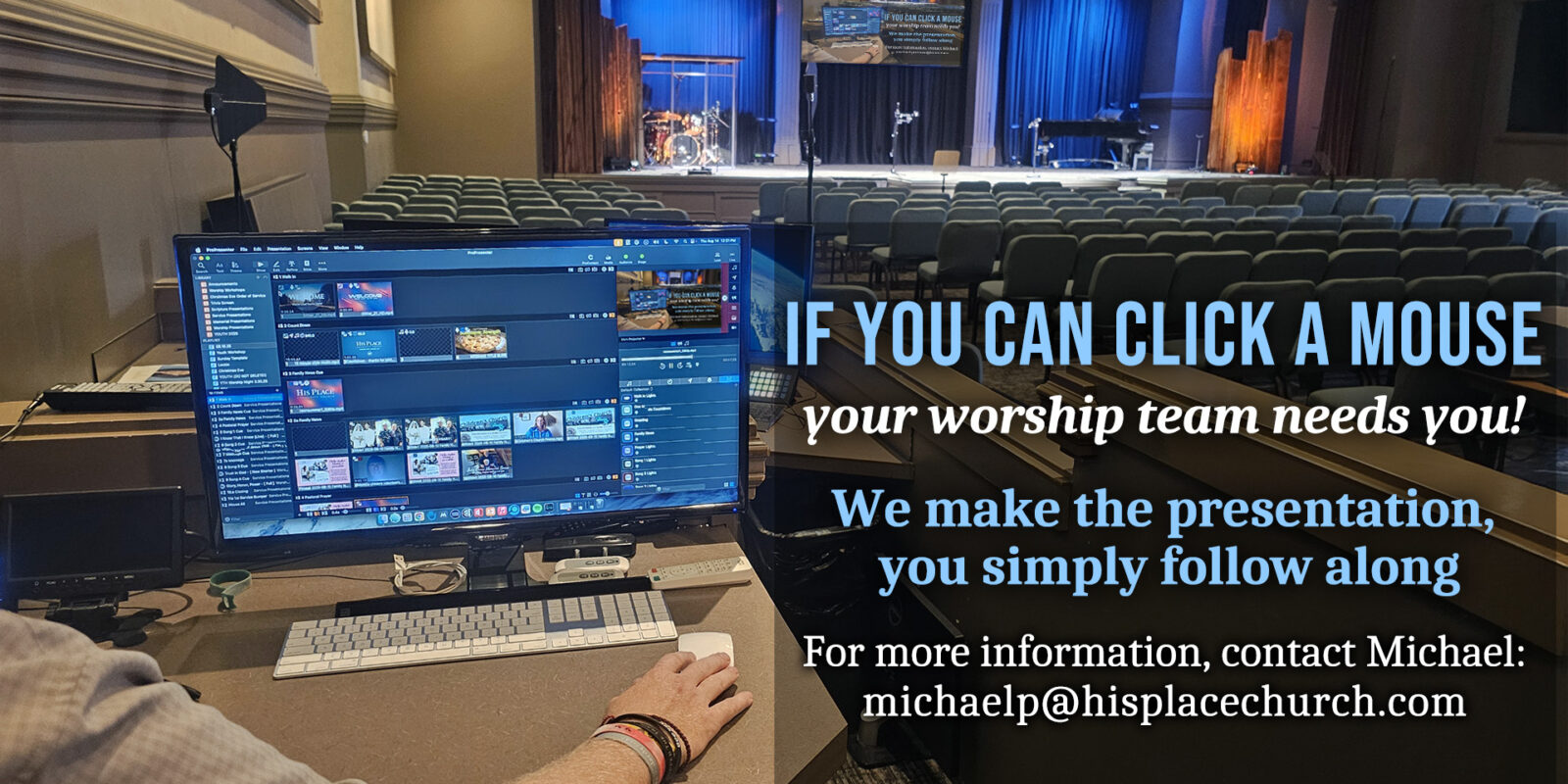 A few new helpers are needed to join our tech team on Sunday mornings. Volunteers will help run ProPresenter, the program we use for lyrics and slides during worship and sermons. No special skills are required—if you can point, click, …