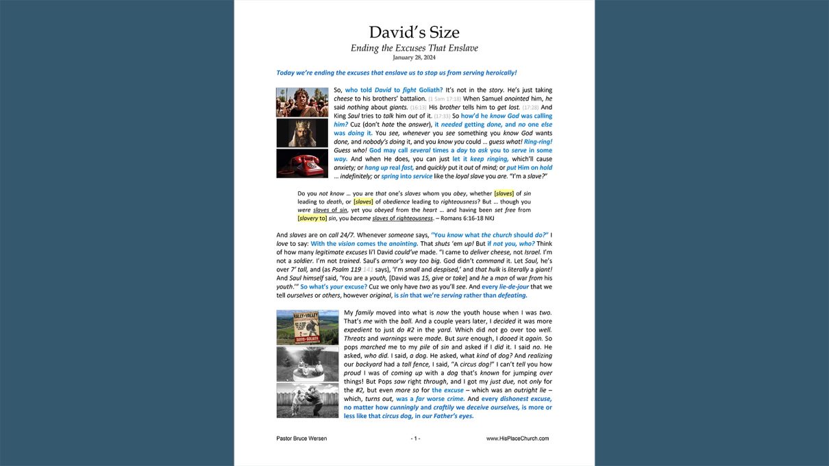 His Place Church January 28, 2024 David’s Size: Ending the Excuses that Enslave Sermon transcript Click here to view “David’s Size: Ending the Excuses that Enslave” (pdf)