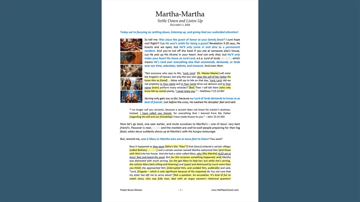 His Place Church December 1, 2024 Martha-Martha: Settle Down and Listen Up Sermon transcript Click here to view “Martha-Martha: Settle Down and Listen Up” (pdf)