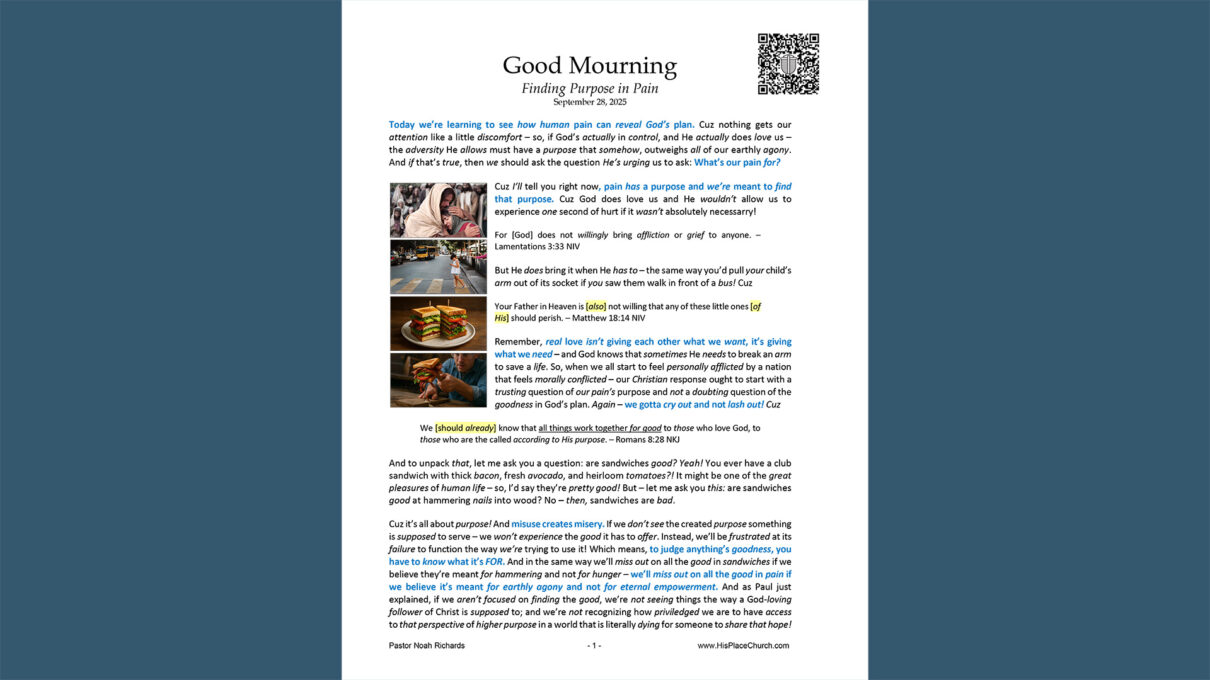His Place Church September 27, 2025 Good Mourning: Finding Purpose in Pain Sermon transcript Click here to view “Good Mourning: Finding Purpose in Pain” (pdf)