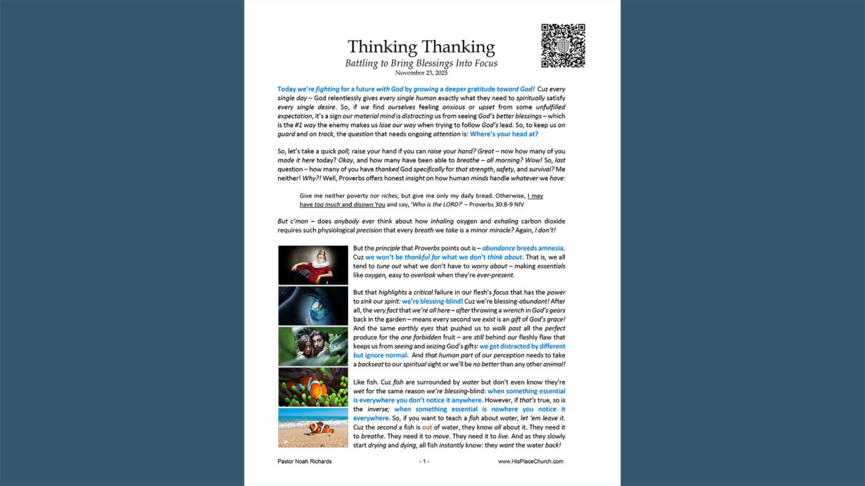 His Place Church November 23, 2025 Thinking Thanking: Battling to Bring Blessings Into Focus Sermon transcript Click here to view “Thinking Thanking: Battling to Bring Blessings Into Focus” (pdf)