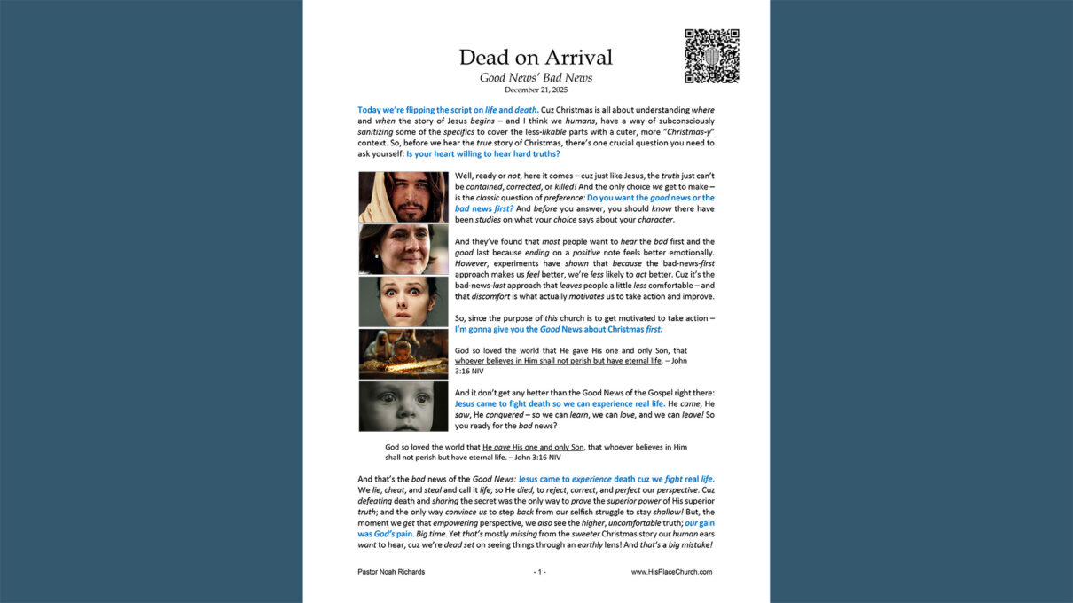 His Place Church Today Dead on Arrival: Good News’ Bad News Sermon transcript Click here to view “Dead on Arrival: Good News’ Bad News” (pdf)