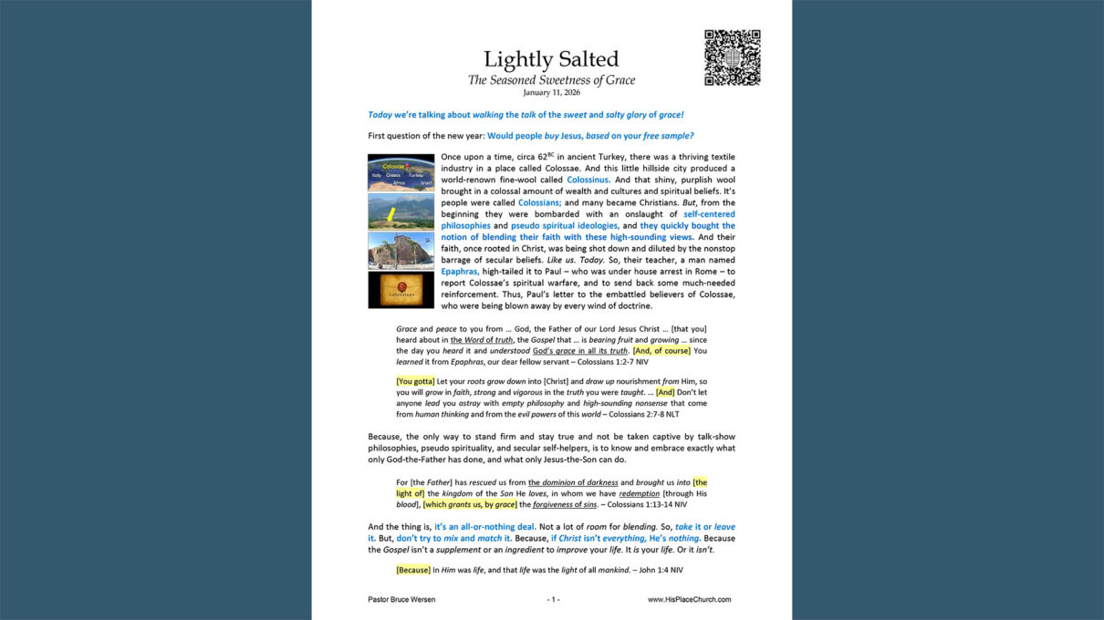 His Place Church January 9, 2026 Lightly Salted: The Seasoned Sweetness of Grace Sermon transcript Click here to view “Lightly Salted: The Seasoned Sweetness of Grace” (pdf)