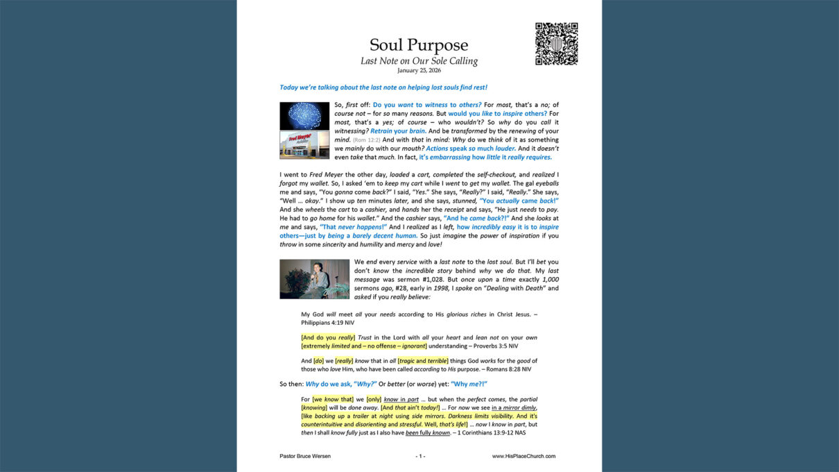 His Place Church January 23, 2026 Soul Purpose: Last Note on Our Sole Calling Sermon transcript Click here to view “Soul Purpose: Last Note on Our Sole Calling” (pdf)