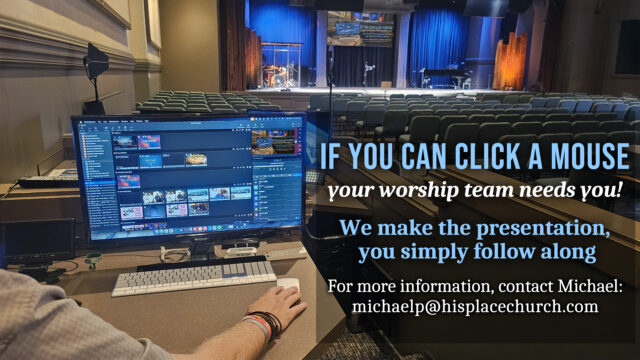 A few new helpers are needed to join our tech team on Sunday mornings. Volunteers will help run ProPresenter, the program we use for lyrics and slides during worship and sermons. No special skills are required—if you can point, click, …